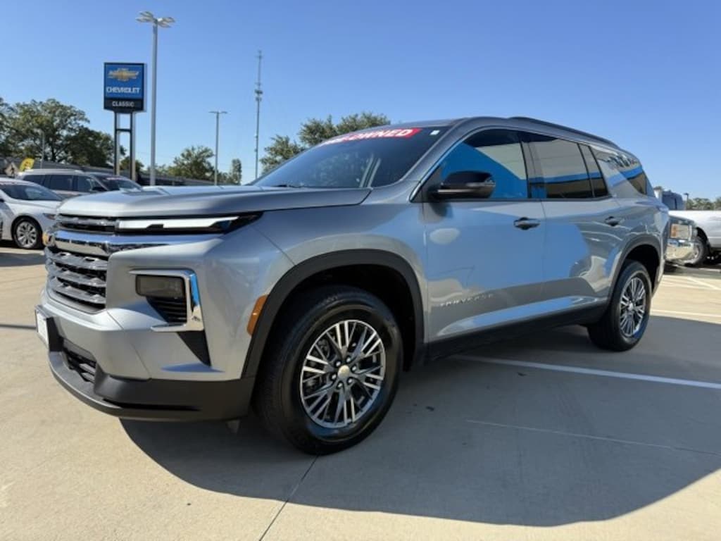 CARFAX One-Owner. Clean CARFAX. 20/27 City/Highway MPG Sterling Gray Metallic 2025 Chevrolet Traverse LT 1LT 2.5L DOHC FWD 8-Speed Automatic The 2025 Chevrolet Traverse comes with the following features; Preferred Equipment Group 1LT, 3rd row seats: split-bench, 4-Way Manual Front Passenger Seat Adjuster, 4-Wheel Disc Brakes, 6 Speakers, 6-Speaker Audio System Feature, 8-Way Power Driver Seat Adjuster, ABS brakes, Air Conditioning, Alloy wheels, AM/FM radio: SiriusXM with 360L, Apple CarPlay/Android Auto, Auto High-beam Headlights, Automatic temperature control, Brake assist, Bumpers: body-color, Child-Seat-Sensing Airbag, Compass, Delay-off headlights, Driver door bin, Driver vanity mirror, Dual front impact airbags, Dual front side impact airbags, Electronic Stability Control, Emergency communication system: OnStar, Four wheel independent suspension, Front anti-roll bar, Front Bucket Seats, Front Center Armrest, Front dual zone A/C, Front reading lights, Fully automatic headlights, Heated door mirrors, Heated front seats, Heated steering wheel, Illuminated entry, Low tire pressure warning, Navigation System, Occupant sensing airbag, Outside temperature display, Overhead airbag, Overhead console, Panic alarm, Passenger door bin, Passenger vanity mirror, Power door mirrors, Power driver seat, Power Liftgate, Power steering, Power windows, Premium Cloth Seat Trim, Radio data system, Radio: Audio System w/17.7 Diagonal Display, Rear air conditioning, Rear anti-roll bar, Rear reading lights, Rear window defroster, Rear window wiper, Remote keyless entry, Security system, SiriusXM w/360L Trial Subscription, Speed control, Speed-sensing steering, Spoiler, Steering wheel mounted audio controls, Tachometer, Telescoping steering wheel, Tilt steering wheel, Traction control, Trip computer, Turn signal indicator mirrors, Variably intermittent wipers, Voltmeter, and Wheels: 18 Grazen Metallic Machined-Face Aluminum. One owner Carfax, Carfax no accidents, Back up camera, Bluetooth.