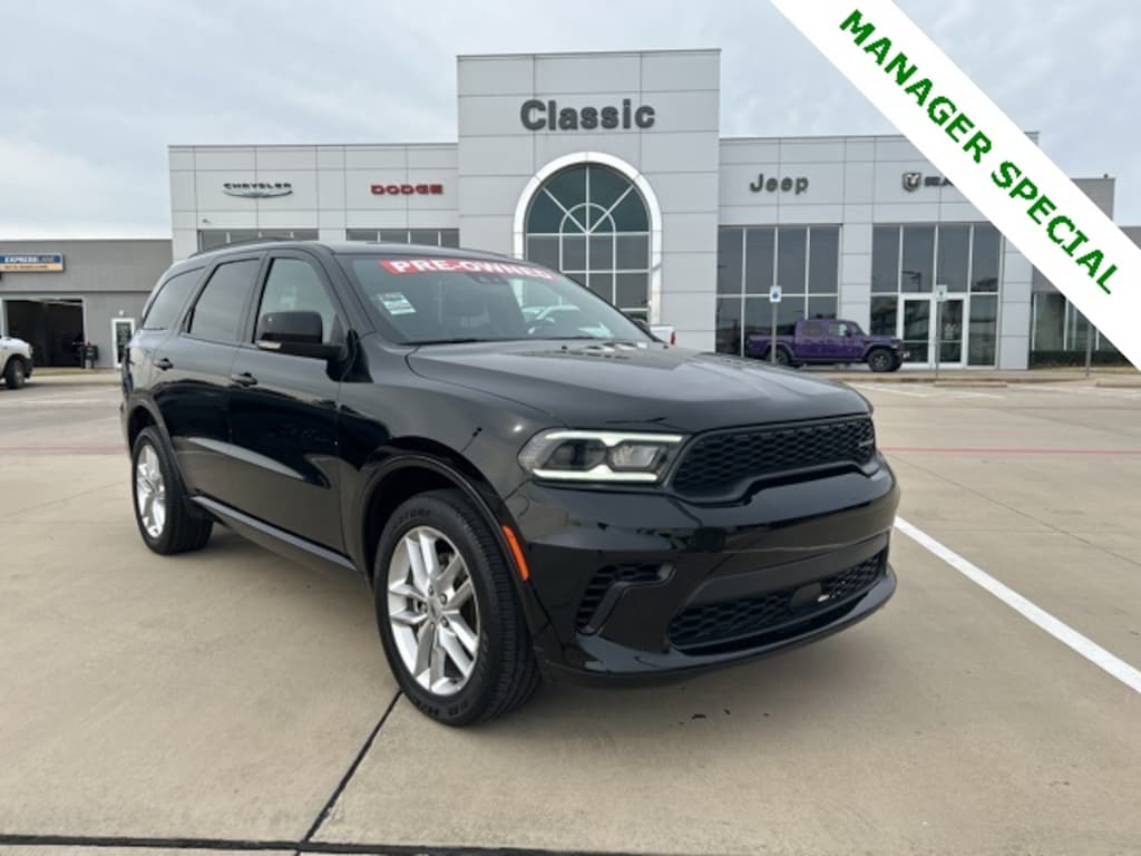 CARFAX One-Owner. Classic CDJR in Texarkana is proud to offer this good-looking 2024 Dodge Durango in DB Black Crystal Clearcoat. This 2024 Dodge Durango comes with the following features; Quick Order Package 2BG GT Plus (1-Year Trial (Registration Required), 10.1" Touchscreen Display, 115V Auxiliary Power Outlet, 180 Amp Alternator, 4G LTE Wi-Fi Hot Spot, 7 & 4 Pin Wiring Harness, Adaptive Cruise Control w/Stop, Apple CarPlay, Auto-Dimming Exterior Driver Mirror, Black Roof Rails, Blind Spot w/Trailer Detection, Class IV Receiver Hitch, Connected Travel & Traffic Services, Disassociated Touchscreen Display, Dual Remote USB Port - Charge Only, Exterior Mirrors w/Heating Element, Exterior Mirrors w/Memory, Exterior Mirrors w/Supplemental Signals, Floor Console w/Leather Armrest, For Details Visit DriveUconnect.com, Full Speed Forward Collision Warning Plus, Global Telematics Box Module (TBM), Gloss Black Exterior Mirrors, Google Android Auto, GPS Antenna Input, GPS Navigation, HD Radio, Heated Second Row Seats, Heavy-Duty Engine Cooling, Integrated Center Stack Radio, Integrated Roof Rail Crossbars, Integrated Voice Command w/Bluetooth, Leather Trimmed Bucket Seats, Leather Wrapped Door Panels, LED Auxiliary Low Beam & Turn Signal, Power 6x9 Multi-Function Foldaway Mirrors, Power 8-Way Driver Memory 8-Way Passenger Seats, Power Driver/Passenger 4-Way Lumbar Adjust, Power Sunroof, Power Tilt & Telescopic Steering Column, Radio: Uconnect 5 Nav w/10.1" Display, Radio/Driver Seat/Mirrors Memory, Rear Load Leveling Suspension, Red Accent Stitching, SiriusXM Guardian - Included Trial (B), SiriusXM w/360L, Trailer Brake Control, USB Host Flip, and Ventilated Front Seats), AWD, 3.45 Rear Axle Ratio, 3rd row seats: split-bench, 4-Wheel Disc Brakes, 6 Speakers, ABS brakes, Air Conditioning, Alloy wheels, AM/FM radio: SiriusXM, Apple CarPlay/Android Auto, Auto-dimming Rear-View mirror, Automatic temperature control, Brake assist, Bumpers: body-color, Cloth Bucket Seats w/Shift Insert, Compass, Delay-off headlights, Driver door bin, Driver vanity mirror, Dual front impact airbags, Dual front side impact airbags, Electronic Stability Control, Four wheel independent suspension, Front anti-roll bar, Front Bucket Seats, Front Center Armrest w/Storage, Front dual zone A/C, Front License Plate Bracket, Front reading lights, Fully automatic headlights, Garage door transmitter, Heated door mirrors, Heated front seats, Heated steering wheel, Illuminated entry, Knee airbag, Leather steering wheel, Low tire pressure warning, Occupant sensing airbag, Outside temperature display, Overhead airbag, Overhead console, Panic alarm, ParkView Rear Back-Up Camera, Passenger door bin, Passenger vanity mirror, Power door mirrors, Power driver seat, Power Liftgate, Power steering, Power windows, Radio data system, Radio: Uconnect 4 w/8.4" Display, Rear air conditioning, Rear anti-roll bar, Rear reading lights, Rear seat center armrest, Rear window defroster, Rear window wiper, Remote keyless entry, Speed control, Speed-sensing steering, Speed-Sensitive Wipers, Split folding rear seat, Spoiler, Sport steering wheel, Steering wheel mounted audio controls, Tachometer, Telescoping steering wheel, Tilt steering wheel, Traction control, Trip computer, Variably intermittent wipers, Voltmeter, and Wheels: 20" x 8.0" Fine SilveR. AWD.