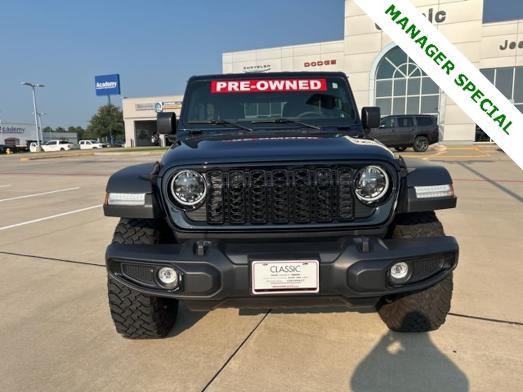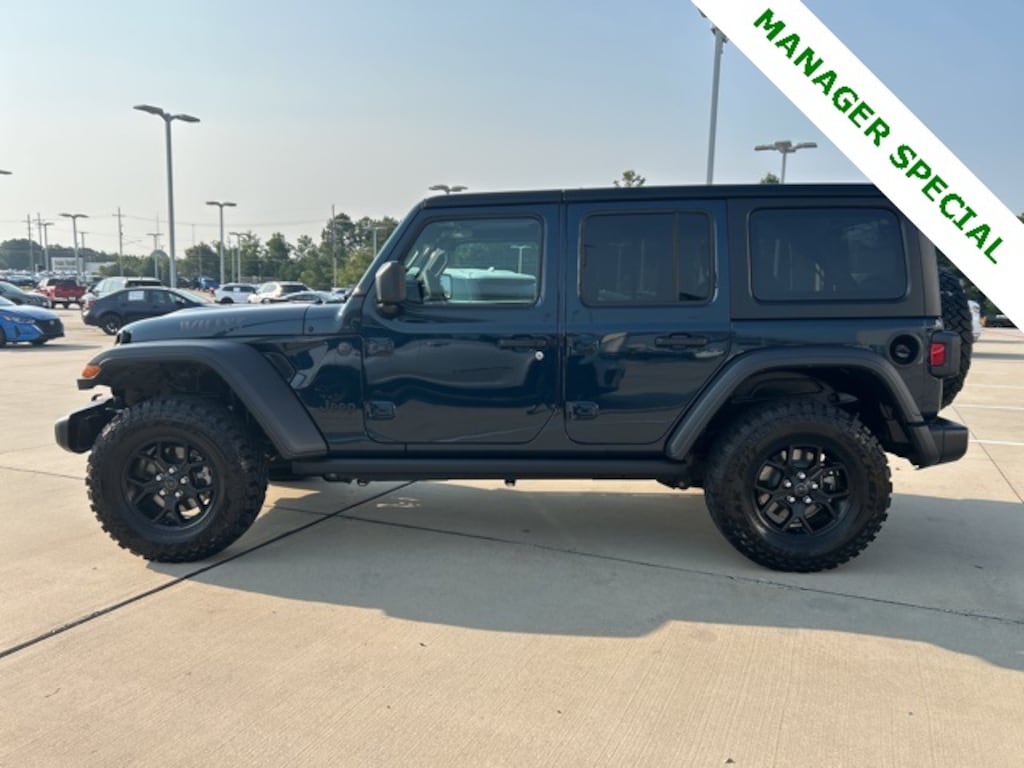 CARFAX One-Owner. Clean CARFAX. Classic CDJR in Texarkana is proud to offer this stunning-looking and fun 2025 Jeep Wrangler in Fathom Blue Pearlcoat. This 2025 Jeep Wrangler comes with the following features; Convenience Group (2-Door Passive Entry, Front Door Locks, Air Conditioning w/Auto Temperature Control, Air Filtering, Cluster 7.0" TFT Color Display, Emergency/Assistance Call, Heated Front Seats, Heated Steering Wheel, Remote Start System, and Universal Garage Door Opener), Quick Order Package 22W Willys (4-Wheel Drive Swing Gate Decal, 4.10 Rear Axle Ratio, 7 & 4 Pin Wiring Harness, 97 MPH Vehicle Max Speed Calibration, Advanced Brake Assist, Automatic Headlamps, Auxiliary Switches, Black Grille, Class II Receiver Hitch, Conventional Differential Front Axle, Corning Gorilla Glass, Dana M210 Wide HD Tube Front Axle, Dana M220 Wide Rear Axle, Daytime Running Lamps LED Accents, Deep Tint Sunscreen Windows, E-Locker Rear Axle, Enhanced Adaptive Cruise Control, Front LED Fog Lamps, Full Speed Forward Collision Warning Plus, Injection Molded Black Rear Bumper, LED Premium Reflector Headlamps, Mold In Color Bumper w/Gloss Black, Molded in Color Rubicon Highline Flare, MOPAR All-Weather Floor Mats, Off-Road Plus Mode, Power Heated Mirrors, Premium Wrapped Steering Wheel, Security Alarm, Sun Visors w/Illuminated Vanity Mirrors, Wheels: 17" x 7.5" Painted Black, Willy's Suspension, and Willys Hood Decal), 110 MPH Vehicle Max Speed Calibration, 3.45 Overall Top Gear Ratio, 4-Wheel Disc Brakes, 8 Speakers, ABS brakes, Air Conditioning, AM/FM radio: SiriusXM, Apple CarPlay/Android Auto, Aux Battery, Black 3-Piece Hard Top, Brake assist, Cloth Low-Back Bucket Seats, Compass, Delay-off headlights, Driver door bin, Driver vanity mirror, Dual front impact airbags, Dual front side impact airbags, Electronic Stability Control, Freedom Panel Storage Bag, Front anti-roll bar, Front Bucket Seats, Front Center Armrest w/Storage, Front fog lights, Front reading lights, Illuminated entry, Integrated roll-over protection, Low tire pressure warning, Non-Lock Fuel Cap w/o Discriminator, Normal Duty Suspension, Occupant sensing airbag, Outside temperature display, Overhead airbag, Panic alarm, ParkView Rear Back-Up Camera, Passenger door bin, Passenger vanity mirror, Power steering, Power windows, Radio data system, Radio: Uconnect 5 w/12.3" Display, Rear anti-roll bar, Rear reading lights, Rear Window Defroster, Rear Window Wiper/Washer, Remote keyless entry, Speed control, Split folding rear seat, Steering wheel mounted audio controls, Stop-Start Dual Battery System, Tachometer, Telescoping steering wheel, Tilt steering wheel, Traction control, Trip computer, Variably intermittent wipers, and Wheels: 17" x 7.5" Black Steel Styled.