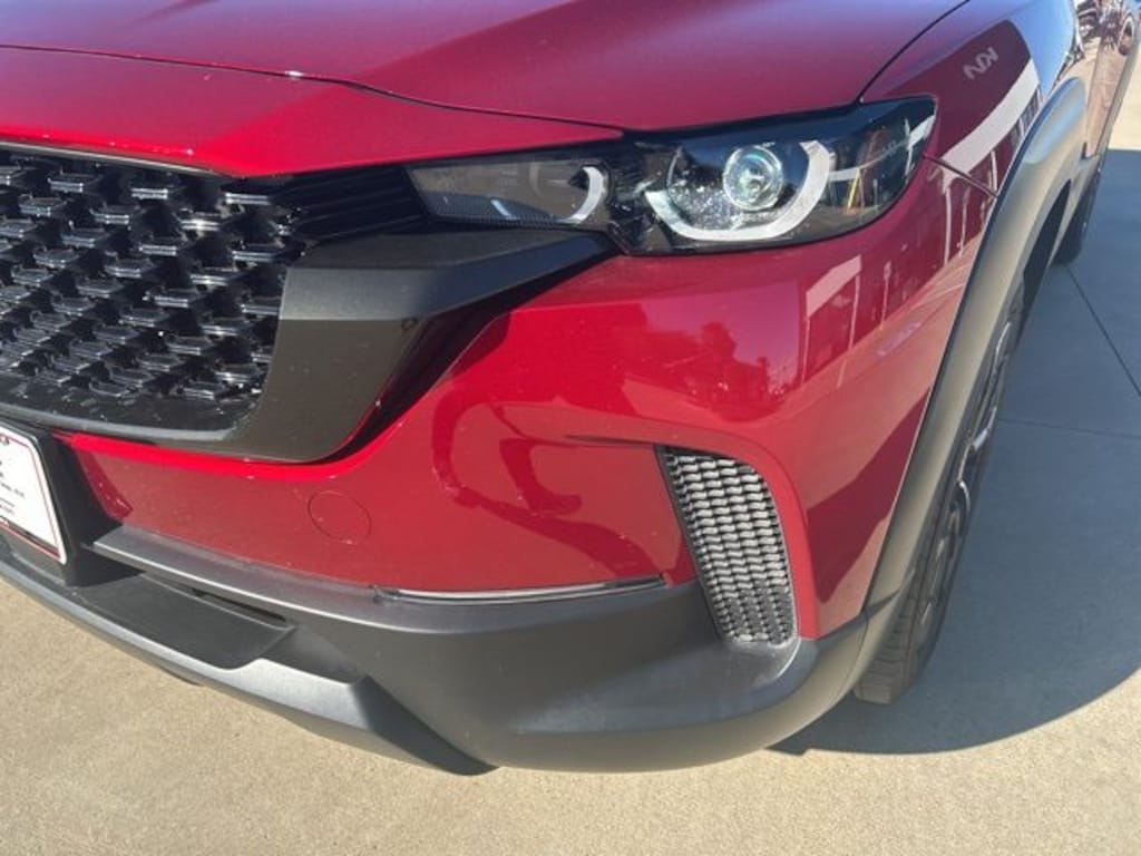 The 2025 Mazda CX-50 Hybrid comes with the following features; Weather Package, 2.5L 4-Cylinder, 12 Speakers, 4-Wheel Disc Brakes, ABS brakes, Air Conditioning, Alloy wheels, AM/FM radio: SiriusXM, AppLink/Apple CarPlay and Android Auto, Auto High-beam Headlights, Auto-dimming Rear-View mirror, Automatic temperature control, Black Lug Nuts and Black Wheel Locks, Brake assist, Bumpers: body-color, Delay-off headlights, Driver door bin, Driver vanity mirror, Dual front impact airbags, Dual front side impact airbags, Electronic Stability Control, Emergency communication system: MAZDA CONNECT, Exterior Parking Camera Rear, Front anti-roll bar, Front Bucket Seats, Front Center Armrest, Front dual zone A/C, Front reading lights, Front wheel independent suspension, Fully automatic headlights, Garage door transmitter: HomeLink, Heads-Up Display, Heated and Ventilated Front Seats with 3 Level Adjustment, Heated door mirrors, Heated front seats, Illuminated entry, Knee airbag, Leather Seat Trim, Leather Shift Knob, Leather steering wheel, Low tire pressure warning, Memory seat, Occupant sensing airbag, Outside temperature display, Overhead airbag, Overhead console, Panic alarm, Passenger door bin, Passenger vanity mirror, Power door mirrors, Power driver seat, Power Liftgate, Power moonroof, Power passenger seat, Power steering, Power windows, Radio data system, Radio: AM/FM/HD Bose 12-Speaker Audio Sound System, Rain sensing wipers, Rear seat center armrest, Rear window defroster, Rear window wiper, Remote keyless entry, Soul Red Crystal Metallic Paint Charge, Speed control, Speed-sensing steering, Split folding rear seat, Spoiler, Steering wheel mounted audio controls, Tachometer, Telescoping steering wheel, Tilt steering wheel, Traction control, Trip computer, Turn signal indicator mirrors, Variably intermittent wipers, Ventilated front seats, and Wheels: 19" x 7.5J Aluminum Alloy Black Metallic with Machine Cut. 2.5L 4-Cylinder.